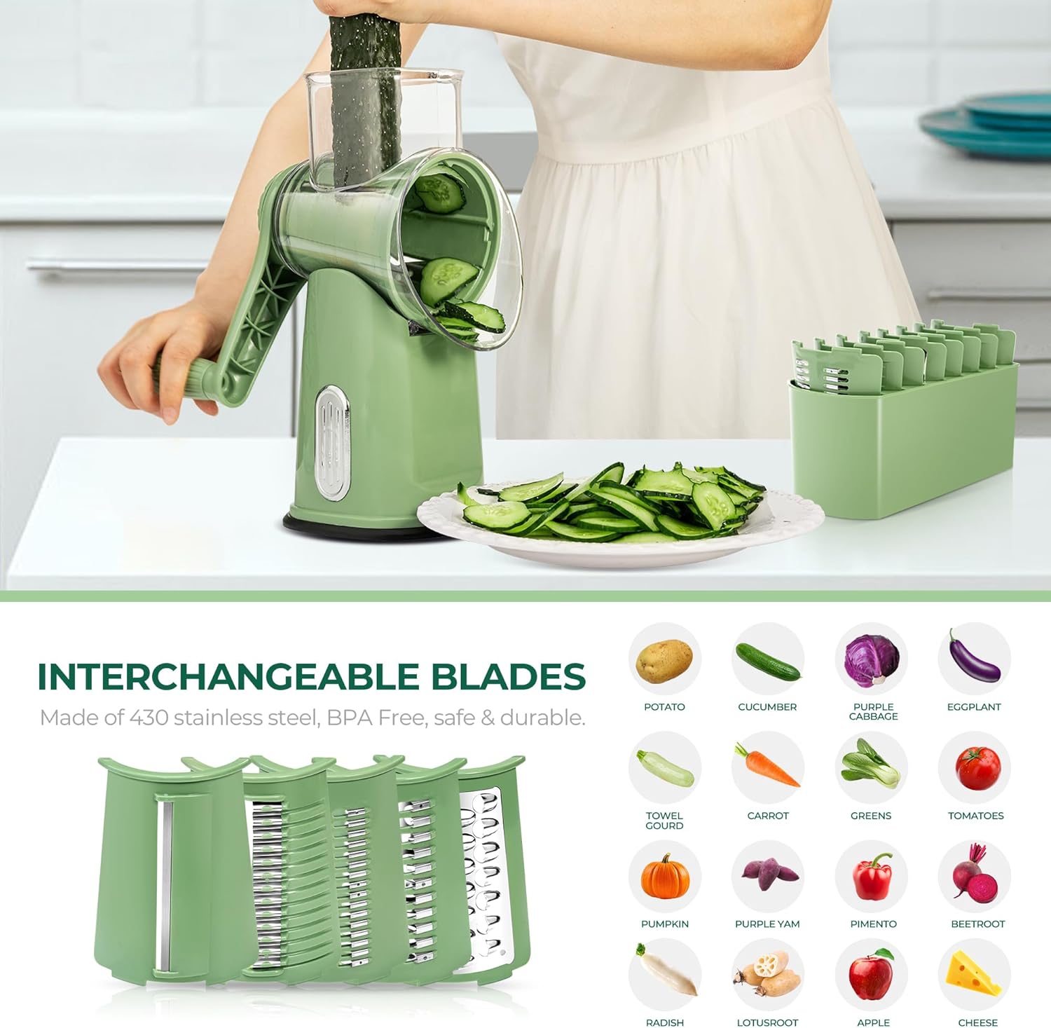 A: It’s a multipurpose powerhouse. It excels at hard cheeses, potatoes, carrots, cucumbers, zucchini, cookies, and even nuts. (Note: Not recommended for soft cheeses or juicy tomatoes).